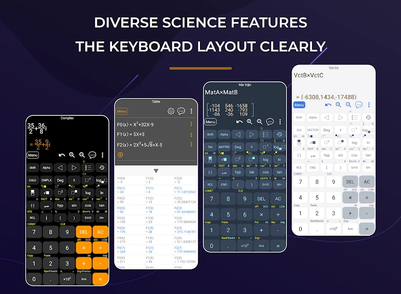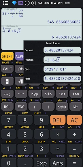- 포괄적인 계산 능력: 분수, 백분율, 복소수, 벡터, 행렬 계산 등 모든 기본적인 수학 연산을 지원합니다.