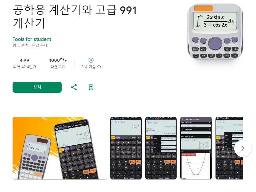 이 어플은 구글플레이스토어에서 "카시오 공학용 계산기"로 검색했을때 4번째로 나오는 어플입니다. 아래는 공학용 계산기 - 계산기 어플에 대한 자세한 설명이니 참고하세요.