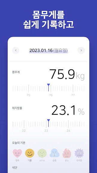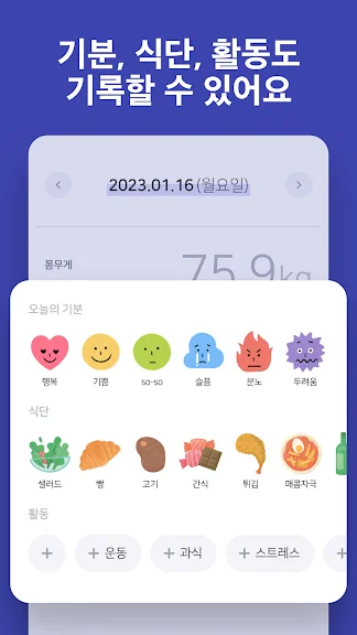 - 귀여운 이모지로 식단과 기분을 간단하게 표현할 수 있어요.
