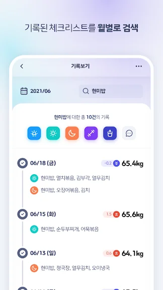 기록된 체크리스트를 월별로 검색하고 1주일 혹은 1개월 동안의 체중변화를 확인해보세요