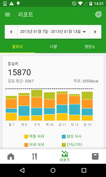 - 일간, 주간, 월간별로 내가 섭취한 칼로리와 영양소 상세 정보도 알 수 있어요