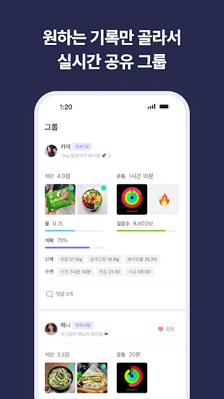 - 참여한 그룹에서 식단, 운동 등 원하는 기록을 실시간으로 공유하고 멤버들과 서로 응원해요.