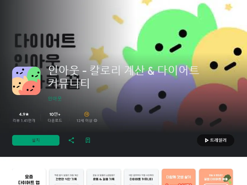 이 어플은 구글플레이스토어에서 "다이어트 기록"로 검색했을때 2번째로 나오는 어플입니다. 아래는 인아웃 - 칼로리 계산 & 다이어트 커뮤니티 어플에 대한 자세한 설명이니 참고하세요.