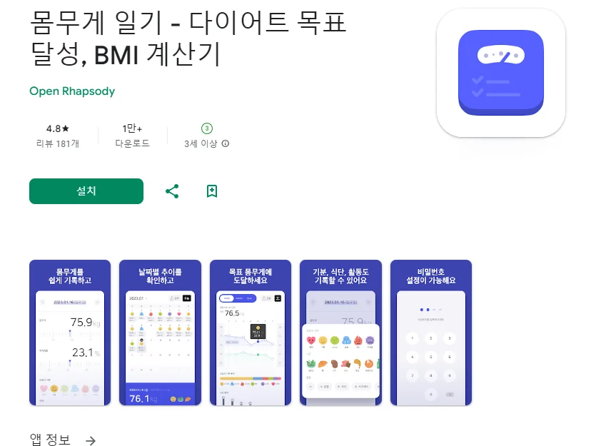 이 어플은 구글플레이스토어에서 "다이어트 기록"로 검색했을때 3번째로 나오는 어플입니다. 아래는 몸무게 일기 - 다이어트 목표 달성, BMI 계산기 어플에 대한 자세한 설명이니 참고하세요.