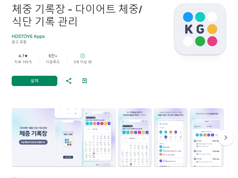 이 어플은 구글플레이스토어에서 "다이어트 기록"로 검색했을때 1번째로 나오는 어플입니다. 아래는 체중 기록장 - 다이어트 체중/식단 기록 관리 어플에 대한 자세한 설명이니 참고하세요.