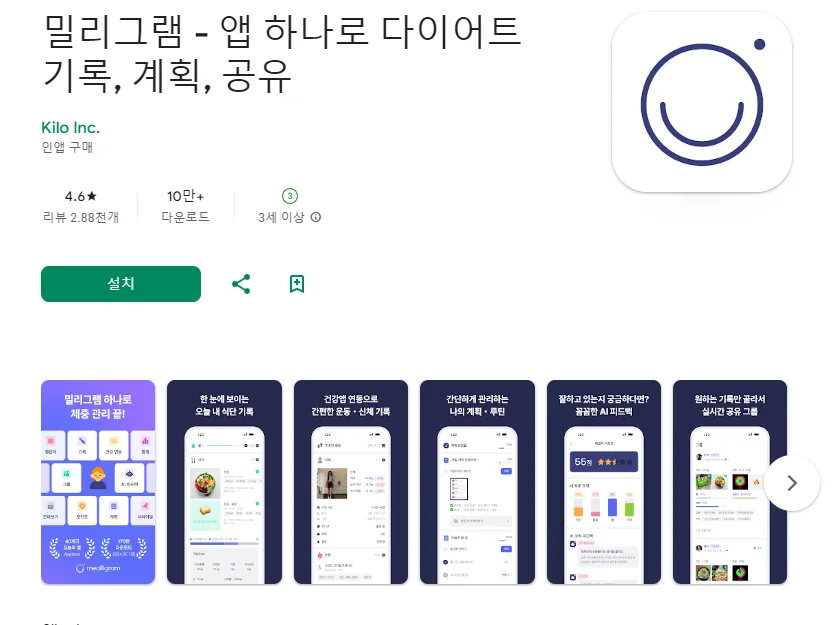 이 어플은 구글플레이스토어에서 "다이어트 기록"로 검색했을때 4번째로 나오는 어플입니다. 아래는 밀리그램 - 앱 하나로 다이어트 기록, 계획, 공유 어플에 대한 자세한 설명이니 참고하세요.