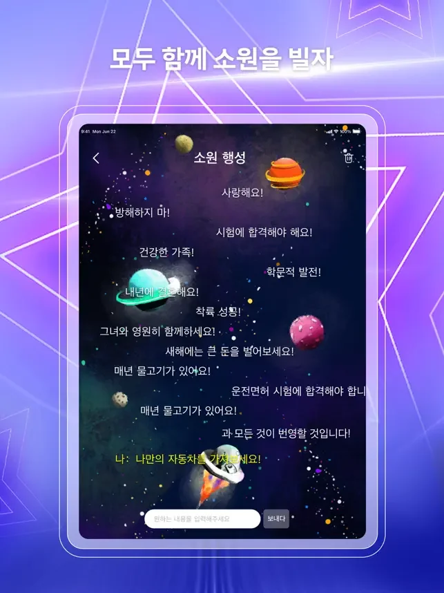 소원은 미래에 대한 개인의 비전, 기대, 목표이며, 소원 플래닛은 성취하고자 하는 소망을 기록하고 소원 플래닛 네트워크를 구축하는 데 도움이 될 수 있습니다.