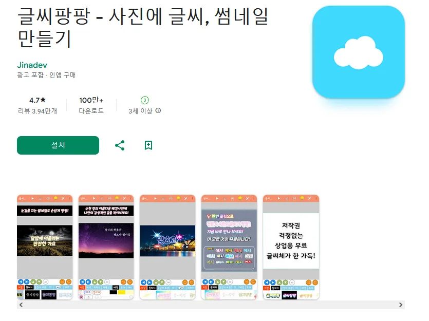 아래는 글씨팡팡 - 사진에 글씨, 썸네일 만들기 어플에 대한 스크린샷 정보입니다.