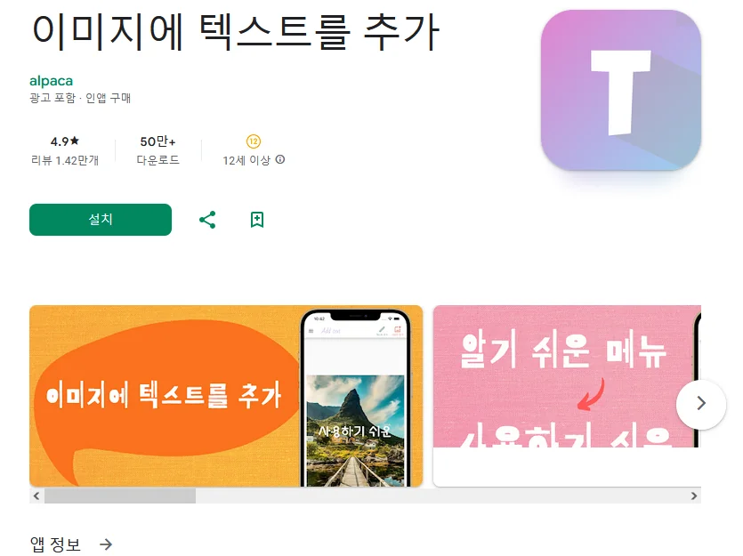 이 어플은 구글플레이스토어에서 "사진에 글씨넣기"로 검색했을때 4번째로 나오는 어플입니다. 아래는 이미지에 텍스트를 추가 어플에 대한 자세한 설명이니 참고하세요.