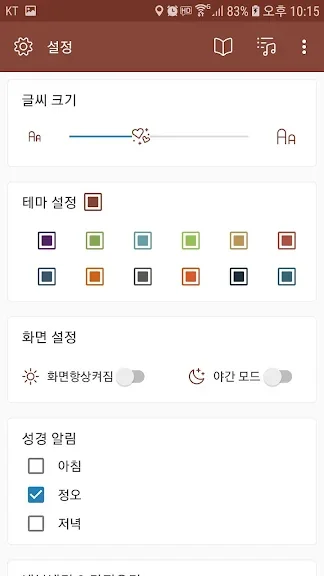 글씨를 크게할 수 도 있고, 배경색을 어둡게 할 수 있으며, 성경을 읽고 있는 동안 스마트 폰이 잠기지 않게 할 수 있습니다.