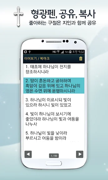 좋아하는 성경구절을 즐겨찾기하고, 카톡으로 공유할 수 있으며, 읽고 있는 성경책을 책갈피로 설정할 수 있습니다.