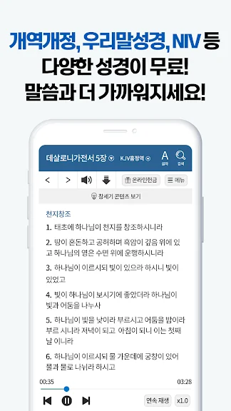 * 오디오 성경은 일부 번역본에서만 지원하며 다운로드가 불가함.