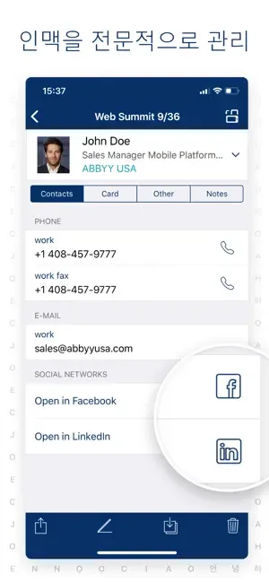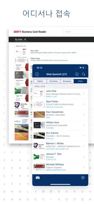 명함에 있는 연락처 정보를 25개 언어로 원활히 캡처하는 ABBYY Business Card Reader (BCR)는 사업상 연락처를 손쉽게 입력하고 관리하는 강력한 다기능 연락처 데이터 관리 앱입니다.