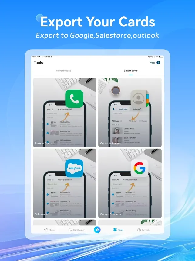 - 스캔한 명함에서 데이터를 Salesforce Leads(프리미엄 계정 필요)로 내보내세요.