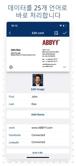 - 다국어 명함(최대 3개 언어를 동시에)을 포함하여 25개 언어로 명함을 인식합니다.