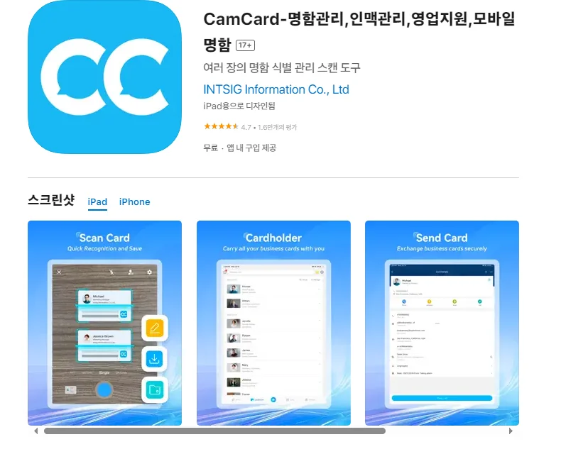 아래는 아이폰 CamCard-명함관리,인맥관리,영업지원,모바일 명함 어플에 대한 자세한 설명입니다. 참고하세요.