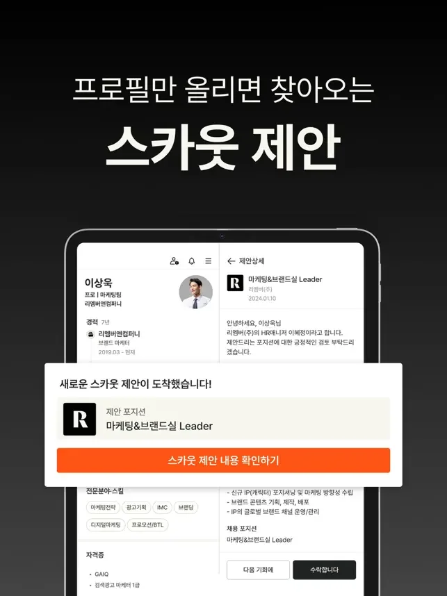 - 프로필만 등록해도 스카웃 제안을 받을 수 있어요.