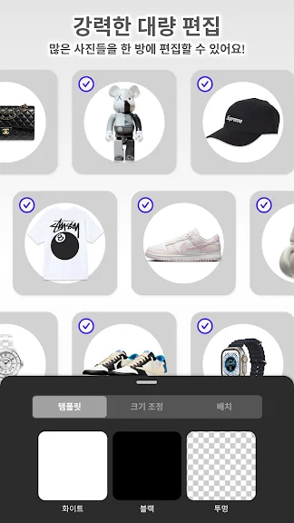 무슨 마법이냐고요? 이 앱은 사진 속의 물건과 인물을 자동으로 자릅니다. 한 번만 탭하면 배경이 제거되고, 고객님의 제품이나 모델을 멋지게 연출한 아름다운 이미지가 생성됩니다. 흰색 배경을 선택하거나, 원하는 배경을 선택하세요. 조명을 수정하고, 텍스트나 로고 또는 스티커를 추가하고, 콜라주를 만드세요. 또는, **1000**개가 ****넘는 ****배경 ****템플릿 중 하나를 사용해 보세요. 사진 스튜디오와 디자인 스튜디오가 모두 손 안에 있는 것처럼 놀라운 효과를 발휘합니다!