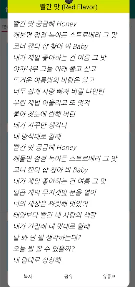 흥얼거리던 멜로디나 기억나는 가사를 검색하면, K-pop은 물론이고 해외 음악까지 쉽게 찾아볼 수 있습니다. 단순히 곡을 검색하는 것에서 그치지 않고, 발견한 가사를 복사하거나 친구들과 공유할 수도 있어 더욱 유용합니다.